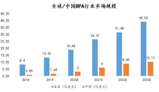 根據(jù)IDC報(bào)告顯示,到2023年底,預(yù)計(jì)全球90%的大型組織將采用某種形式的RPA技術(shù),全球RPA軟件市場(chǎng)規(guī)模將達(dá)到39億美元,2018-2023年復(fù)合增長(zhǎng)率達(dá)36%。中國(guó)RPA市場(chǎng)也將高速發(fā)展,2023年市場(chǎng)規(guī)模將達(dá)到10.2億美元,2018-2023年復(fù)合增長(zhǎng)率為64%。
