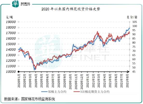 今年上半年以來,以棉花為主的原材料價(jià)格運(yùn)行在兩年內(nèi)的最高位。自6月下旬以來,棉花開啟新一輪趨勢(shì)性上漲,至今累計(jì)漲幅超15%。截止8月16日,江蘇、浙江等地區(qū)棉花現(xiàn)貨價(jià)格已攀升至18100元/噸上方。此外,羊毛價(jià)也創(chuàng)下多年來的新高,中國(guó)濮院28支仿羊絨市場(chǎng)價(jià)格在7月初就突破32000元/噸大關(guān)。