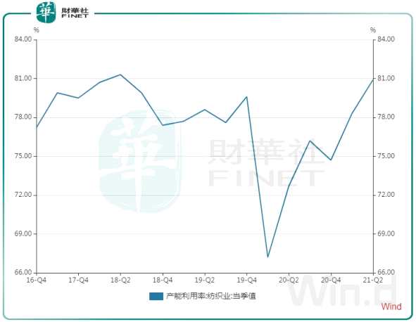 下游消費(fèi)端的強(qiáng)勁復(fù)蘇,驅(qū)動(dòng)了上游紡織制造業(yè)產(chǎn)能利用率的提升。統(tǒng)計(jì)局?jǐn)?shù)據(jù)顯示,今年二季度,我國(guó)紡織業(yè)產(chǎn)能利用率達(dá)到了80.9%的歷史高位,環(huán)比和同比分別增長(zhǎng)2.6個(gè)百分點(diǎn)及8.2個(gè)百分點(diǎn)。而半年度紡織業(yè)產(chǎn)能利用率為79.7%,高于同期全國(guó)工業(yè)77.9%的水平。