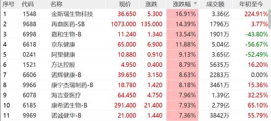 醫(yī)藥股上演暴力反彈,金斯瑞生物暴漲17%,再鼎醫(yī)藥漲超14%,嘉和生物漲超13%,京東健康漲近12%,阿里健康漲超9%,諾輝健康、康寧杰瑞漲超8%。