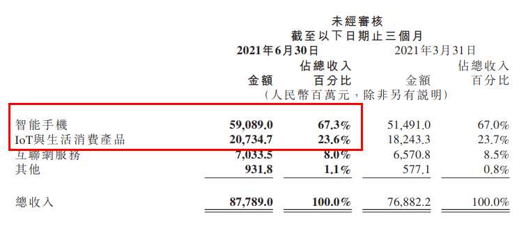 2021年第二季度,公司的IoT與生活消費(fèi)產(chǎn)品業(yè)務(wù)繼續(xù)表現(xiàn)強(qiáng)勁,收入實(shí)現(xiàn)人民幣207億元,同比增長(zhǎng)35.9%。主要是由于空調(diào)、筆記本電腦及智能手環(huán)等若干IoT產(chǎn)品需求增長(zhǎng)。