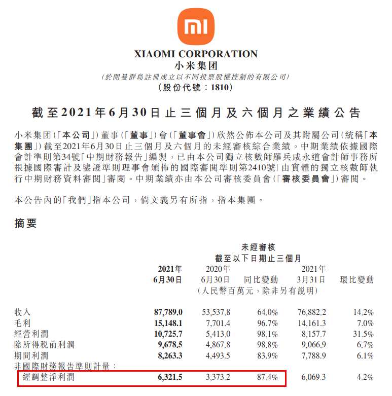 小米集團(tuán):第二季度經(jīng)調(diào)整凈利潤(rùn)達(dá)63億元 同比增長(zhǎng)87.4%