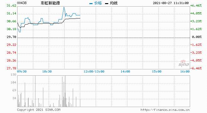 彩虹新能源(0438.HK)漲4.71%,報(bào)31.1港元,總市值55億港元。