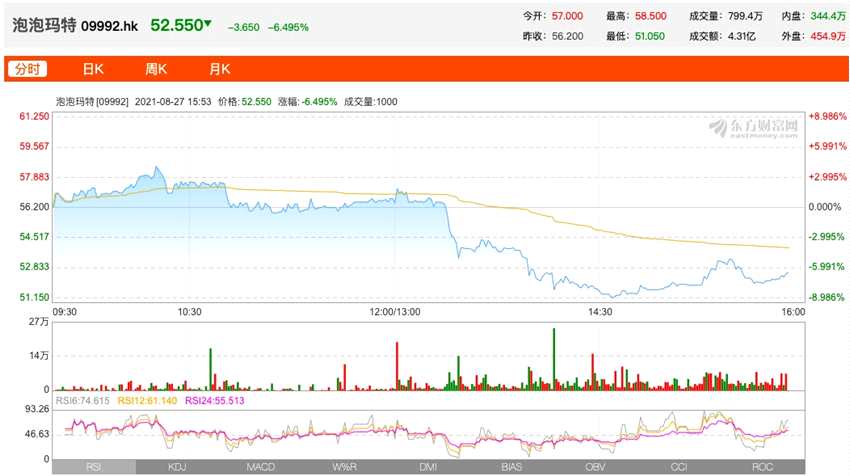 截至發(fā)稿,泡泡瑪特報52.55港元/股,跌幅為6.50%,總市值約735億港元。