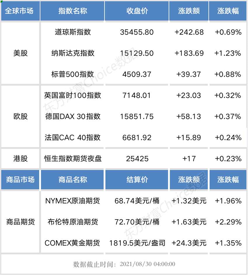 摘要: 恒生夜市期指收報(bào)25425點(diǎn),漲17點(diǎn),漲幅0.23%。美東時(shí)間上周五,美股三大指數(shù)全線上漲,納指和標(biāo)普500指數(shù)續(xù)創(chuàng)歷史新高。截止收盤,道指漲242.68點(diǎn),報(bào)35455.8點(diǎn),