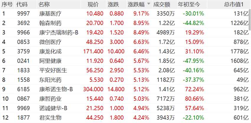 今日醫(yī)藥股反彈,康基醫(yī)療漲超9%,翰森制藥、康寧杰瑞制藥漲超8%,微創(chuàng)醫(yī)療、康龍化成(300759,股吧)漲超6%,阿里健康、平安好醫(yī)生、【東陽光(600673)、股吧】(600673,股吧)藥、康希諾等集體爆發(fā)。