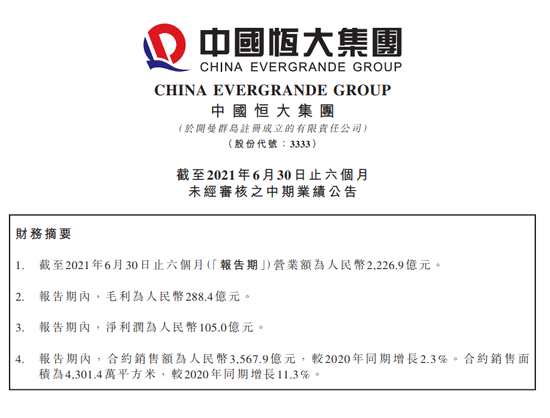 中國(guó)恒大:2021年上半年?duì)I收2226.9億元 凈利潤(rùn)143.83億元