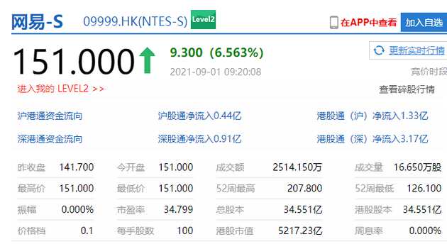 新浪科技訊 9月1日上午消息,港股網(wǎng)易開漲6.563%,報(bào)每股151港元,總市值5217.23億港元。