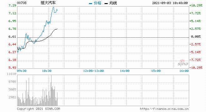 9月3日消息,恒大汽車快速拉升,一度漲超10%,現(xiàn)漲8.62%,報(bào)7.18港元,最新市值701.41億港元。