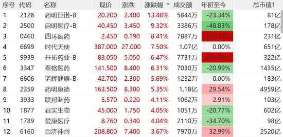 醫(yī)藥股爆發(fā),藥明巨諾漲超13%,啟明醫(yī)療漲超9%,四環(huán)醫(yī)藥漲超8%,開拓藥業(yè)、時代天使等漲超6%,藥明康德(603259,股吧)漲超5%。