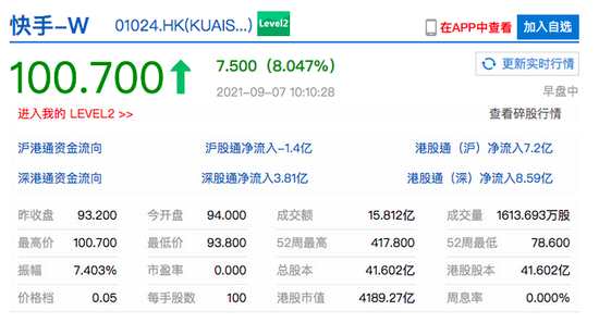 新浪科技訊 9月7日上午消息,港股快手漲超8%,報(bào)100.7港元每股,股價(jià)重回100港元上方,市值約4189.3億港元。