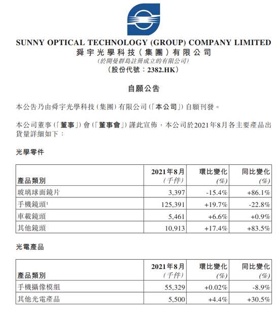 舜宇光學(xué)科技:8月手機鏡頭模組出貨量1.254億件 同比減少22.8%