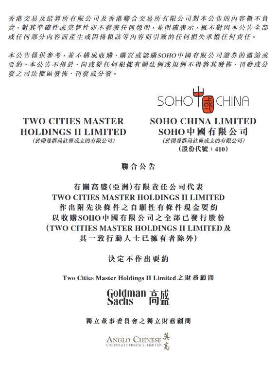 SOHO中國表示,此前高盛代表黑石集團收購本公司全部已發(fā)行股份的要約,鑒于目前滿足先決條件的進展不足,各方一致認為無法在最后截止日當天或之前滿足先決條件,各方也一致同意不會推遲最后截止日。