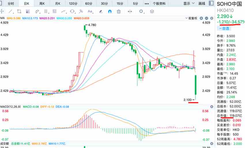 9月13日訊:受9月10日SOHO中國(guó)宣布黑石集團(tuán)終止收購(gòu)的影響,今日SOHO中國(guó)(00410.HK)開(kāi)盤(pán)暴跌,盤(pán)中一度跌至每股2.10港元。截至下午收盤(pán),跌幅為34.57%,每股報(bào)價(jià)2.29港元,總市值為119.07億港元。