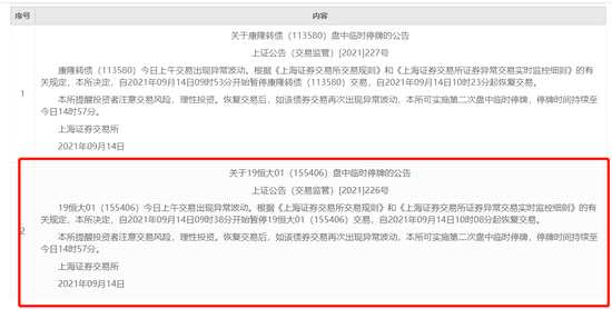 本所提醒投資者注意交易風(fēng)險,理性投資?;謴?fù)交易后,如該債券交易再次出現(xiàn)異常波動,本所可實施第二次盤中臨時停牌,停牌時間持續(xù)至今日14時57分。