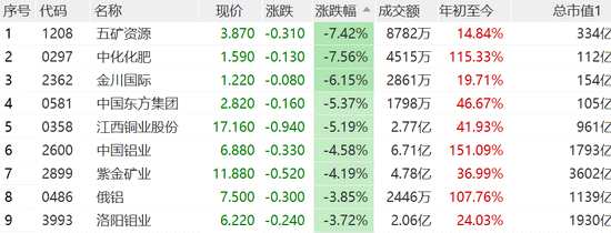 有色股大跌,五礦資源跌超7%,金川國際跌超6%,江西銅業(yè)跌超5%。