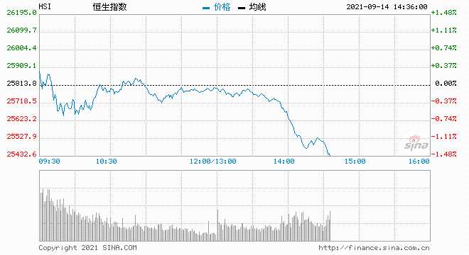 9月14日消息,港股恒指午后快速跳水,截至發(fā)稿,恒指跌超1%,報25544點。阿里健康跌近6%,領(lǐng)跌藍籌。