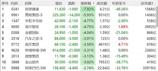 恒生科技指數(shù)跌2%,阿里健康跌8%,攜程跌近6%,嗶哩嗶哩跌超3%,阿里跌2.7%,快手、美團(tuán)跌2.5%,騰訊跌1.8%。