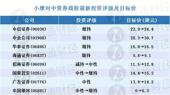 小摩:更新中資券商股評(píng)級(jí)及目標(biāo)價(jià)(表) 首選中金公司及中信證券