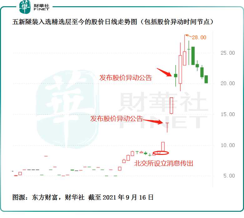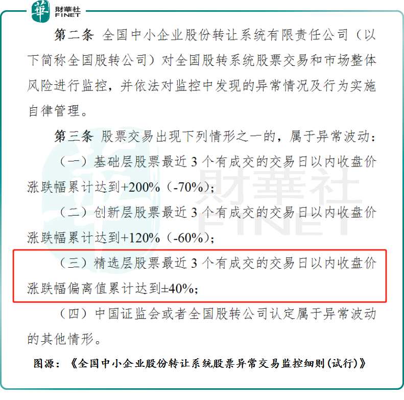 至此,精選層迎來了前所未有的聚光燈,包括五新隧裝在內(nèi)的多只成分股于9月3日收盤實現(xiàn)30%的最高漲幅。值得注意的,疊加9月2日錄得15.89%的漲幅,五新隧裝3個交易日的漲幅,已經(jīng)觸及《全國中小企業(yè)股份轉(zhuǎn)讓系統(tǒng)股票異常交易監(jiān)控細則(試行)》中第三條股價異常波動規(guī)定的漲跌幅累計偏離值±40%的風控線。