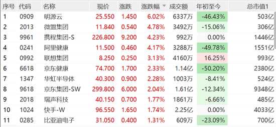 摘要: 恒生科技指數(shù)漲超1%,明源云漲超6%,攜程、阿里健康漲超4%,快手、京東等漲2%,騰訊、美團(tuán)等漲超1%。