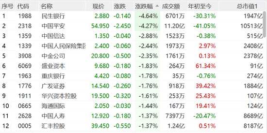金融股大跌,民生銀行(600016,股吧)跌近5%,中國平安跌超4%,股價再創(chuàng)新低,中金公司、中國信達跌超2%,中國人壽、匯豐控股、廣發(fā)證券(000776,股吧)等跌超1%。