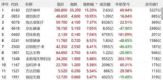 恒生醫(yī)療保健指數(shù)漲超4%,百濟(jì)神州漲超15%,微創(chuàng)醫(yī)療漲超10%,海吉亞醫(yī)療、京東健康、四環(huán)醫(yī)藥等漲超7%,阿里健康、啟明醫(yī)療、信達(dá)生物等漲超6%。