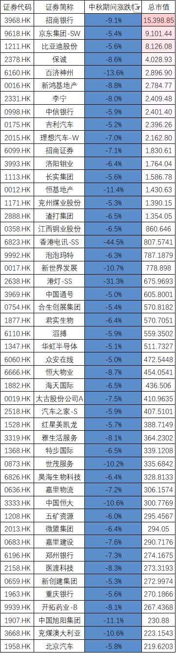 中秋假期期間,港股恒指跌2.8%,恒生科技指數跌3.2%,萬億(港元)市值的招行跌超9%,3000億市值的百濟神州跌近14%,此外,中信銀行跌6%,新世界發(fā)展、世茂服務、恒基地產等跌超10%。(以下是中秋兩天跌幅超5%的超200億市值公司)