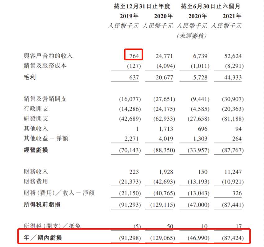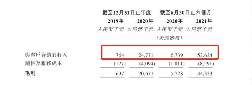 財務(wù)方面,數(shù)坤科技2019年、2020年的營收(與客戶合約的收入)分別為76.4萬元、2477.1萬元。2021年上半年,數(shù)坤科技營收5262.4萬元,而2020年同期營收673.9萬元。