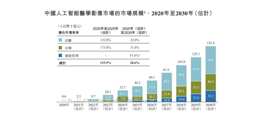 隨著市場需求不斷增長,中國的人工智能醫(yī)學(xué)影像解決方案市場預(yù)期將進(jìn)入爆發(fā)式增長期,從2020年的不到人民幣10億元增加至2025年的人民幣442億元,復(fù)合年增長率為135.9%,并預(yù)計于2030年進(jìn)一步增加至人民幣1,554億元,2025年至2030年的復(fù)合年增長率為28.6%。