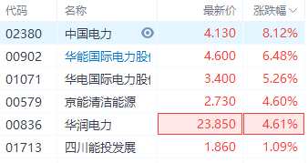 9月24日消息,港股電力股持續(xù)走高,中國電力漲超8%,華能國際電力股份漲超6%,華電國際電力股份漲超5%,京能清潔能源、華潤電力漲4.6%。