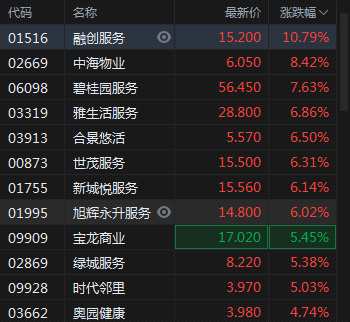 9月28日消息,內(nèi)地物業(yè)管理股上漲,融創(chuàng)服務(wù)漲近11%,中海物業(yè)漲8.42%,碧桂園服務(wù)漲7.63%,雅生活服務(wù)漲6.86%,合景悠活漲6.5%,世茂服務(wù)漲6.31%。