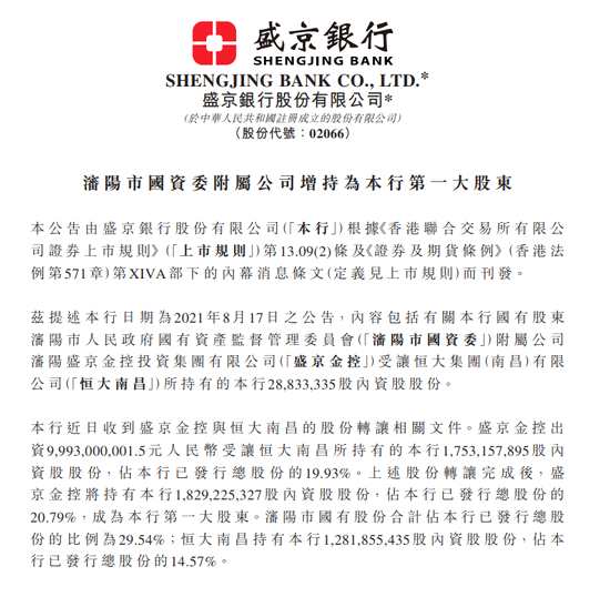 9月29日消息,盛京銀行在港交所發(fā)布公告,本行近日收到盛京金控與恒大南昌的股份轉讓相關文件。盛京金控出資9,993,000,001.5元人民幣受讓恒大南昌所持有的本行1,753,157,895股內資股股份,占本行已發(fā)行總股份的19.93%。上述股份轉讓完成后,盛京金控將持有本行1,829,225,327股內資股股份,占本行已發(fā)行總股份的20.79%,成為本行第一大股東。沈陽市國有股份合計占本行已發(fā)行總股份的比例為29.54%;恒大南昌持有本行1,281,855,435股內資股股份,占本行已發(fā)行總股份的14.57%。