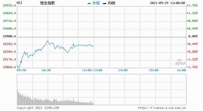 摘要: 9月29日消息,美股周二收跌。美債收益率攀升令股指承壓。今日開盤,港股恒指低開0.91%,隨后跌幅收窄。截至午間收盤,恒生指數(shù)跌0.45%,報24389.78點;國企指數(shù)跌0.76%,