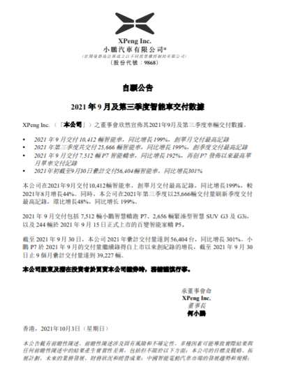 摘要: 小鵬汽車-W(09868)發(fā)布公告,2021年9月交付1.04萬輛智能車,同比增長199%,創(chuàng)單月交付最高記錄。2021年第三季度共交付2.56萬輛智能車,同比增長199%。