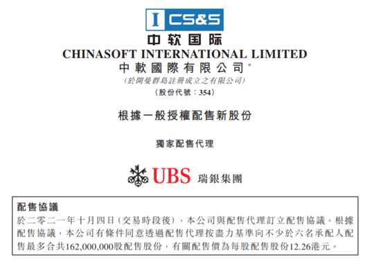 摘要: 中國軟件國際發(fā)布配售公告,于二零二一年十月四日(交易時段后),公司與配售代理訂立配售協議。根據配售協議,公司有條件同意透過配售代理按盡力基準向不少于六名承配人配售最多合共1.62億股配售股份,