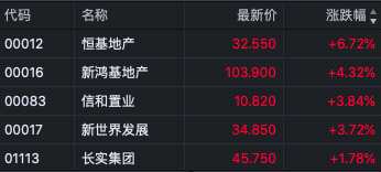 10月7日消息,藍(lán)籌地產(chǎn)股集體上漲,恒基地產(chǎn)漲近7%,新鴻基地產(chǎn)漲超4%,信和置業(yè)漲3.84%,新世界發(fā)展?jié)q3.72%,長實(shí)集團(tuán)漲1.78%。