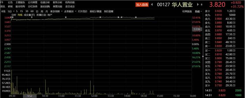 摘要: 財聯(lián)社(上海,鄭遠方)停牌4天后,華人置業(yè)今早復(fù)牌,高開近28%。截至發(fā)稿,華人置業(yè)股價上漲31.72%,報3.82港元,而相比9月27日創(chuàng)下的低點1.98港元,漲幅超九成。