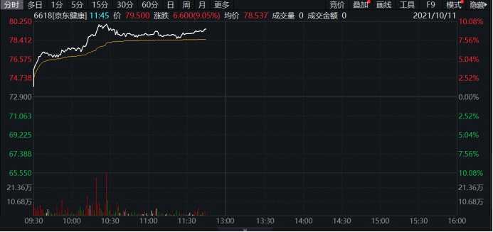 京東健康盤中漲幅一度在10%左右,一舉收復(fù)60日線。