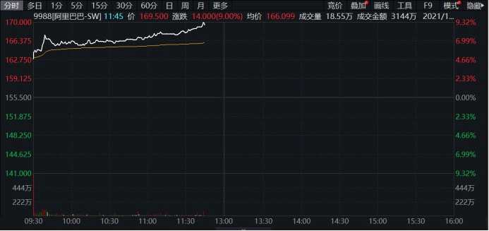 阿里巴巴港股漲超9%。
