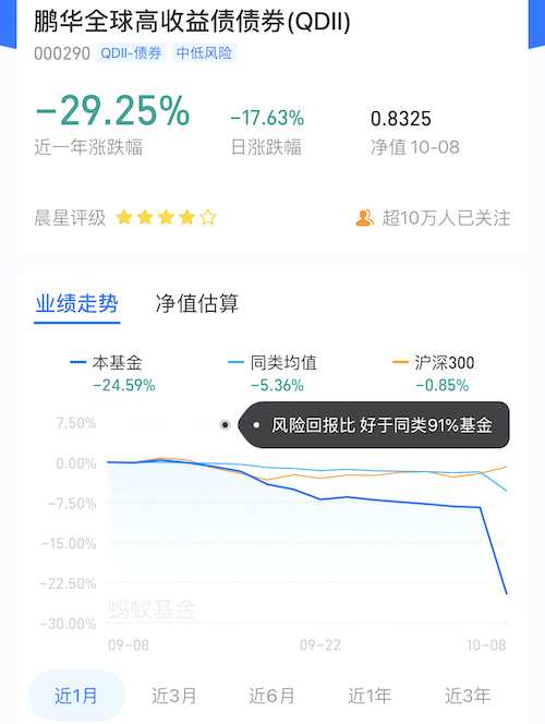 以鵬華全球高收益?zhèn)?人民幣計(jì)價)為例,公開數(shù)據(jù)顯示,在10月8日當(dāng)日,該基金凈值跌幅高達(dá)17.63%,單位凈值0.8325元,可謂“斷崖式”回撤。