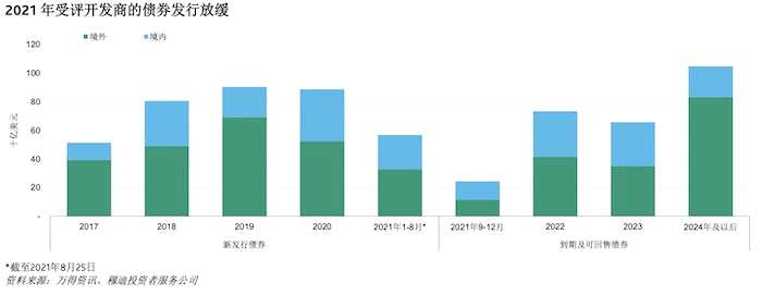 經(jīng)歷7月地產(chǎn)債大跌之后,地產(chǎn)債新發(fā)規(guī)模開始大幅縮量。相關(guān)數(shù)據(jù)顯示,今年8月地產(chǎn)債發(fā)行規(guī)模10.36億美元,而同期到期規(guī)模為35.4億美元。在華夏幸福和四川藍(lán)光等開發(fā)商違約之后,評級B的開發(fā)商融資環(huán)境轉(zhuǎn)弱,因?yàn)橥顿Y者傾向于選擇期限較短、票面利率更高的債券,今年前7個月,70家受穆迪評級的開發(fā)商境內(nèi)外債券發(fā)行規(guī)模較去年同期下降。