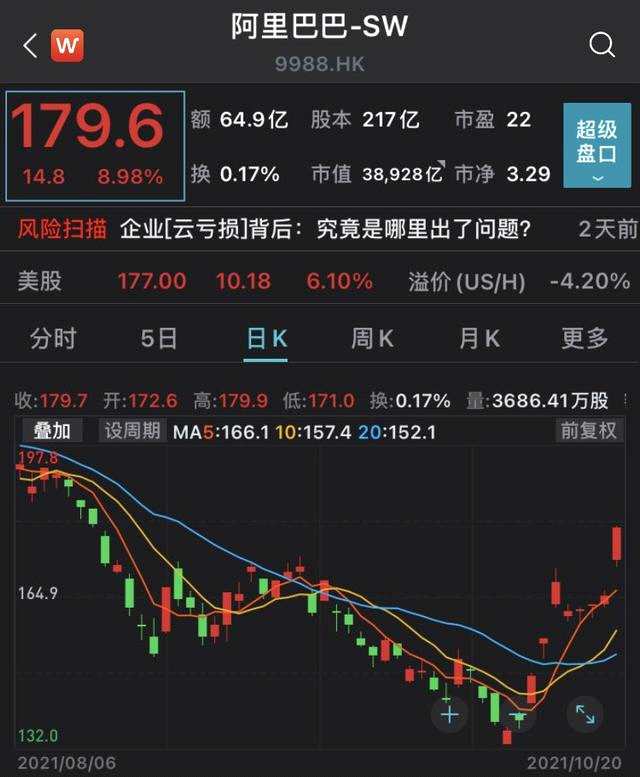 截止發(fā)稿,阿里巴巴報(bào)179.6元/股,漲8.98%。