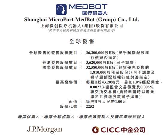 微創(chuàng)機器人(300024,股吧)今日公布發(fā)售文件,公司擬發(fā)行3620萬股H股,其中90%為國際發(fā)售,10%為香港發(fā)售,另有最多15%超額配股權,股票代碼0052,每股發(fā)行價36-43.2港元,每手500股,入場費2.18萬港元,今日起招股,招股時間為10月21日至10月26日,預期11月2日上市。