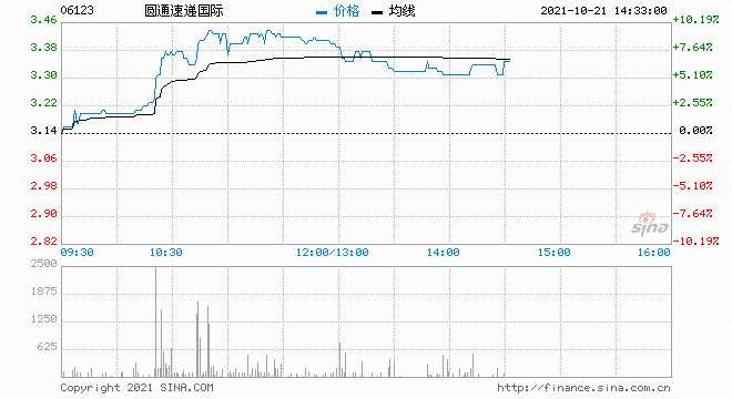 10月21日消息,圓通速遞AH股齊漲,A股漲停,報15.49元;H股漲5.41%,報3.31港元。