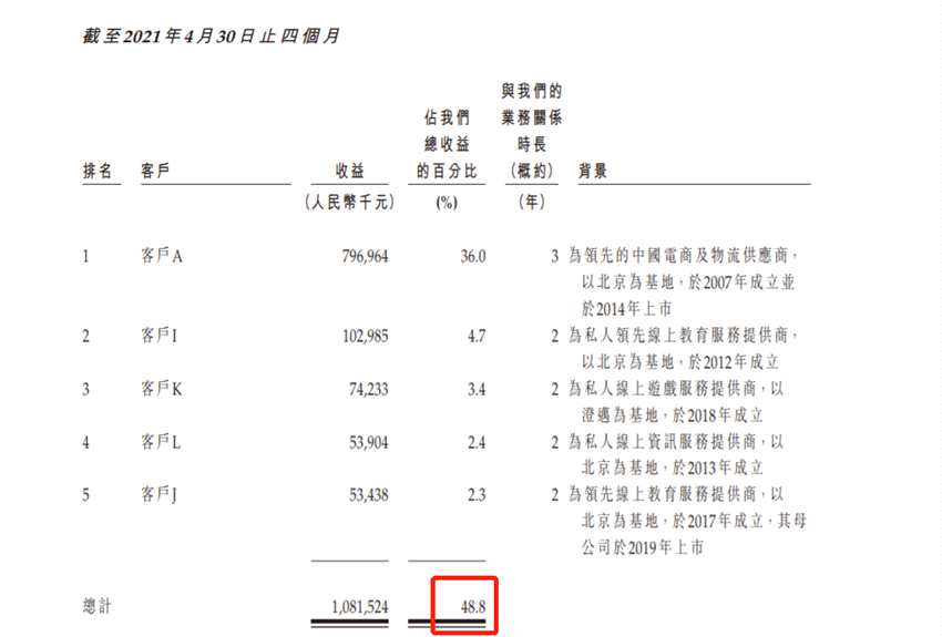 招股書(shū)顯示,2018年-2021年1-4月優(yōu)矩互動(dòng)來(lái)自五大客戶的收益分別占總收益約50.8%、47.7%、57.8%及48.8%,同期來(lái)自最大客戶的收益分別占總收益約25.4%、24.5%、42.3%及36.0%。