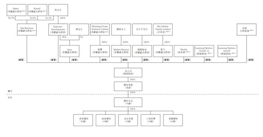 股權(quán)結(jié)構(gòu)上,馬曉輝直接持股為50.76%。IPO前,馬曉輝持有所有管理股份(占VastBusiness所有已發(fā)行股份31.3%),擁有整體管理權(quán)并控制在VastBusiness股東大會(huì)上由彼全權(quán)和絕對(duì)酌情權(quán)行使100%的投票權(quán)。