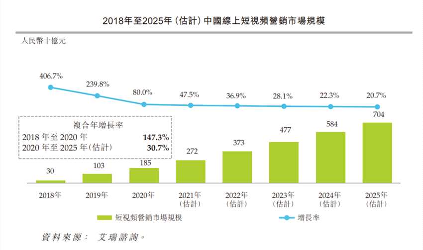 而中國(guó)在線短視頻營(yíng)銷市場(chǎng)的市場(chǎng)規(guī)模由2018年的人民幣302億元大幅增至2020年約人民幣1,846億元,復(fù)合年增長(zhǎng)率為147.3%。由于在線短視頻平臺(tái)的快速發(fā)展、在線短視頻營(yíng)銷解決方案越來(lái)越流行以及互聯(lián)網(wǎng)移動(dòng)設(shè)備的普及與信息技術(shù)基礎(chǔ)設(shè)施的升級(jí),在線短視頻營(yíng)銷市場(chǎng)預(yù)期將由2020年的人民幣1,846億元進(jìn)一步增長(zhǎng)至2025年的人民幣7,043億元,復(fù)合年增長(zhǎng)率為30.7%。