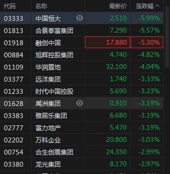 內(nèi)房股集體下跌 中國(guó)恒大、合景泰富跌近6%融創(chuàng)中國(guó)跌超5%