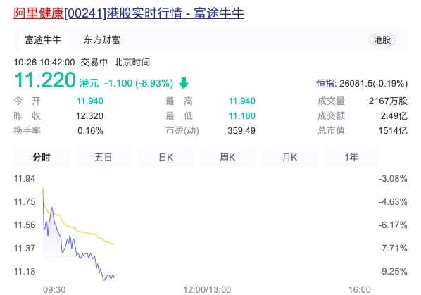 港股阿里健康股價今日一路下行,截至發(fā)稿,股價跌8.93%,報11.22港元。